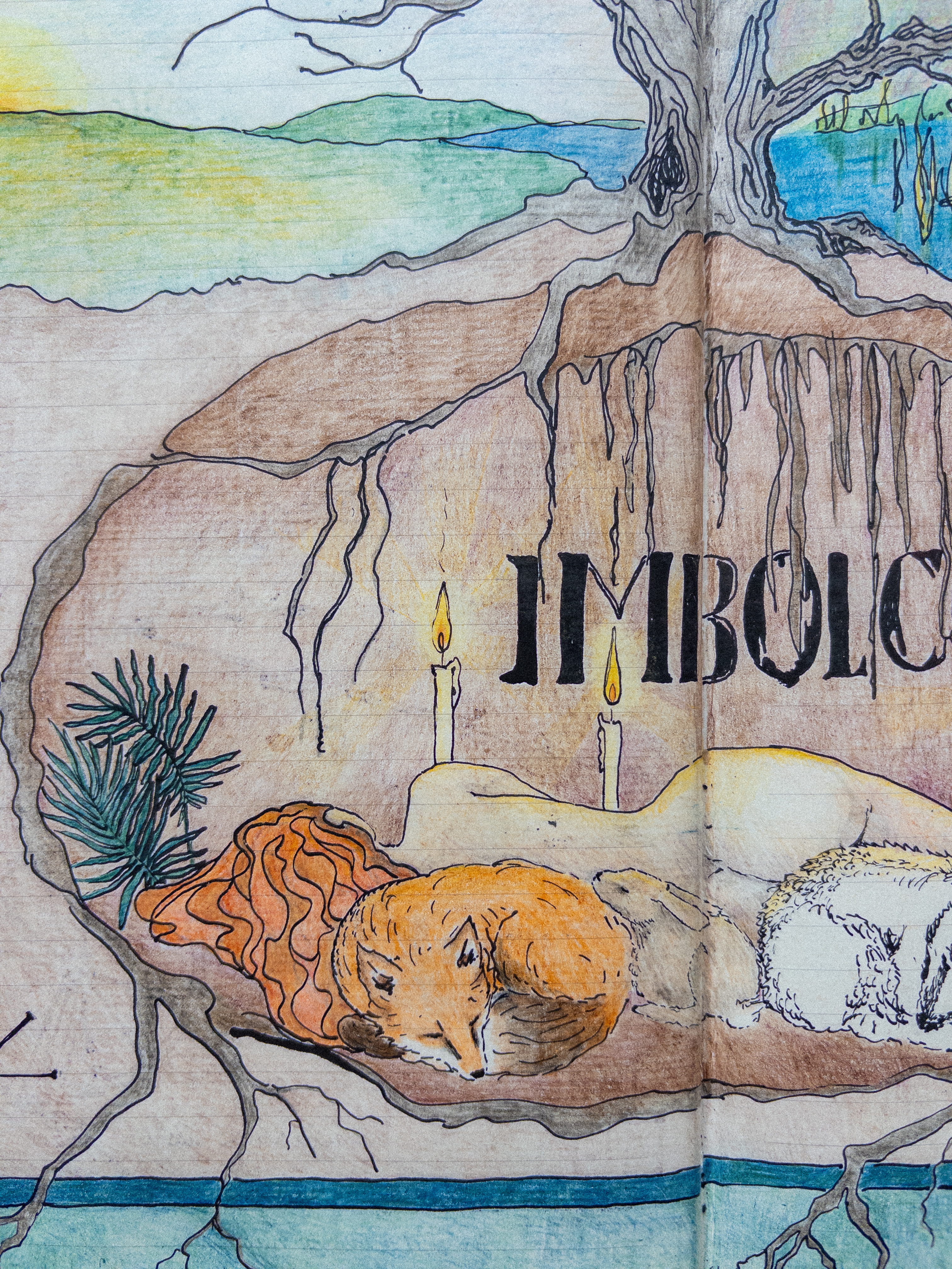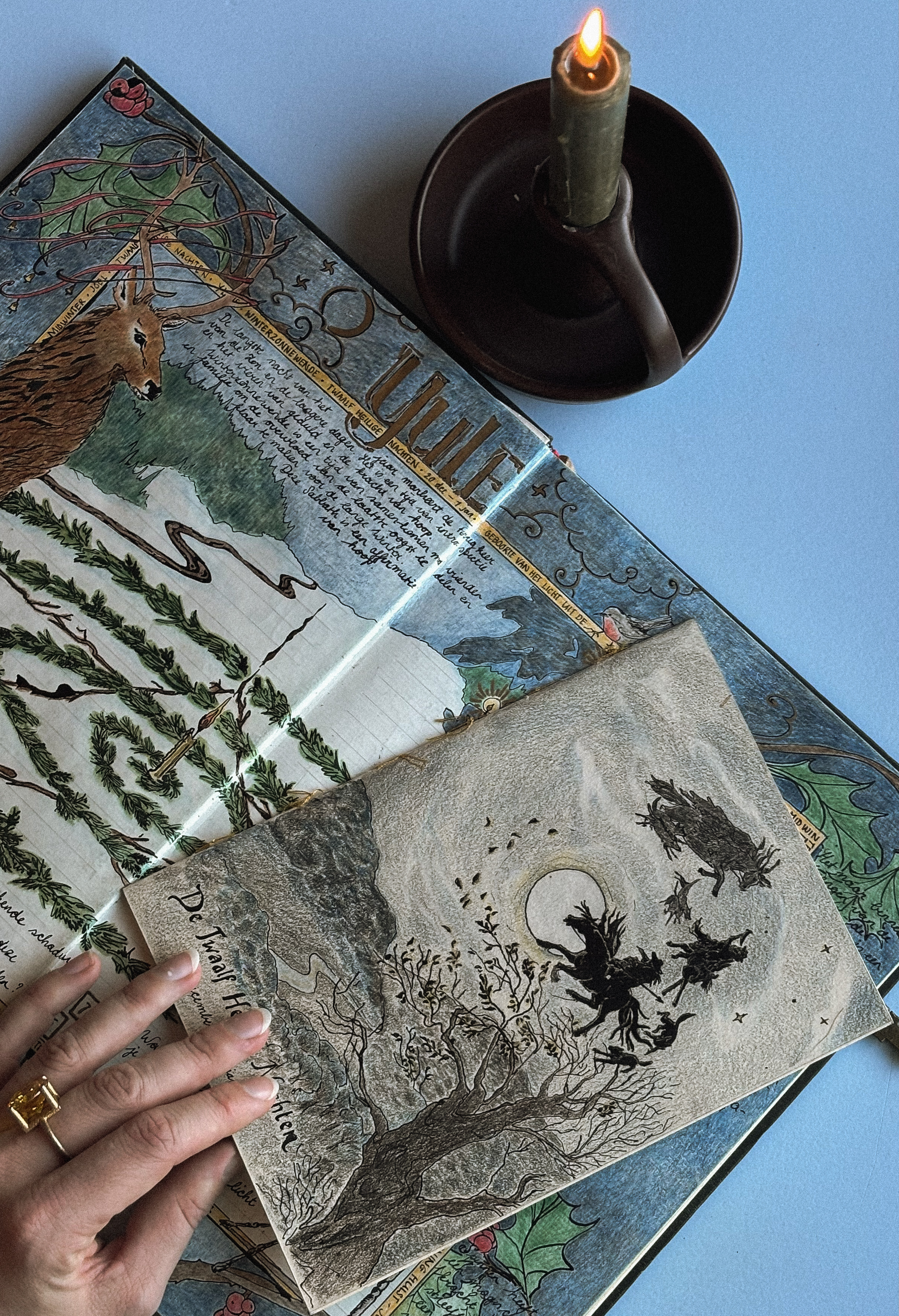 Naast mijn professionele praktijk als kunstenaar werk ik al jaren aan een grimoire: een persoonlijk, groeiend boek vol beelden, rituelen en verhalen, geworteld in het land om me heen. In dit boek teken en verzamel ik, geïnspireerd door oude Keltische en Germaanse gebruiken en hun relatie tot het land en de seizoenen. Het is een plek voor onderzoek en verbeelding, alleen voor mijn ogen.