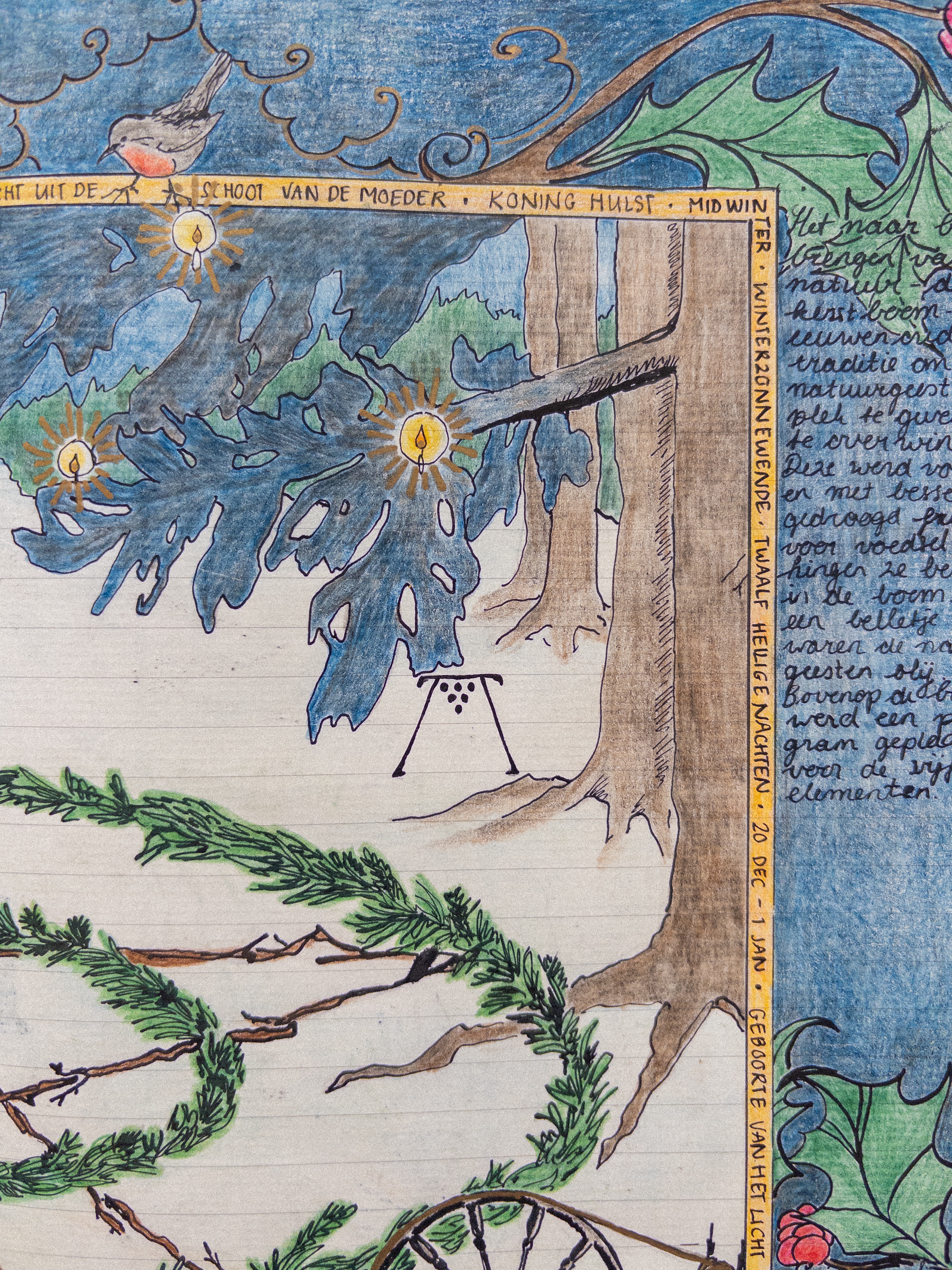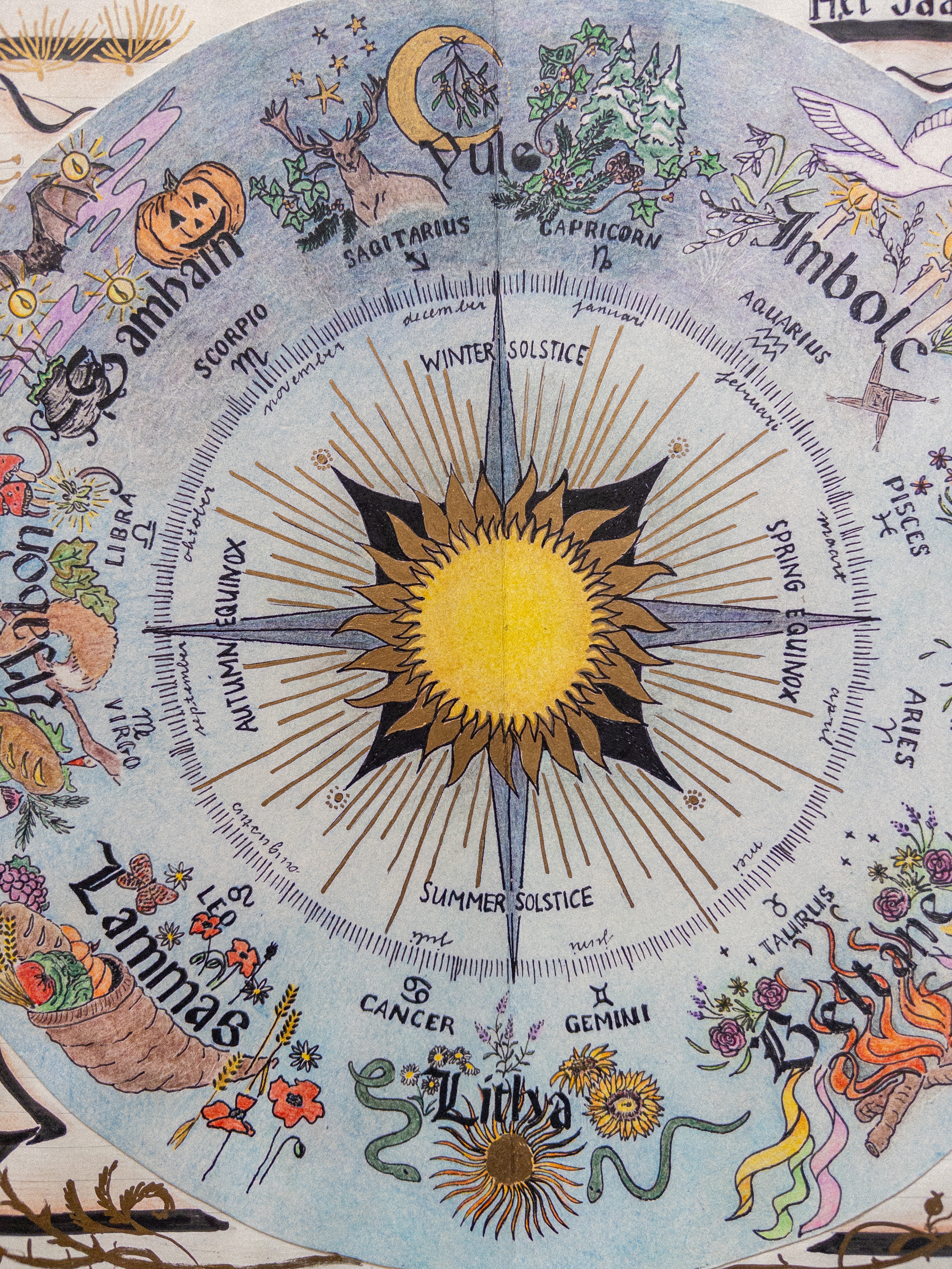 In dit jaartraject nodig ik je uit om ook zo’n grimoire te ontwikkelen: een visueel en artistiek proces waarin jaarfeesten, verhalen en jouw persoonlijke verbinding daarmee gedurende een jaar worden vertaald naar beeld, in een gezamenlijke verdieping. Alle media zijn welkom; je boek kan uit losse paginas bestaan en later gebonden worden zodat er altijd aan kan worden toegevoegd, het kan een boek zijn die je al langer in de kast hebt liggen, het kan groot of klein zijn, je kunt tekenen, schilderen, collages maken, teksten schrijven of juist alleen met beeld werken.